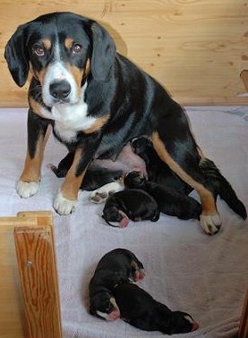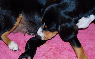 Welpe 1 ist am 7. Mai um 4.00 Uhr da, trinkt und wird geputzt
